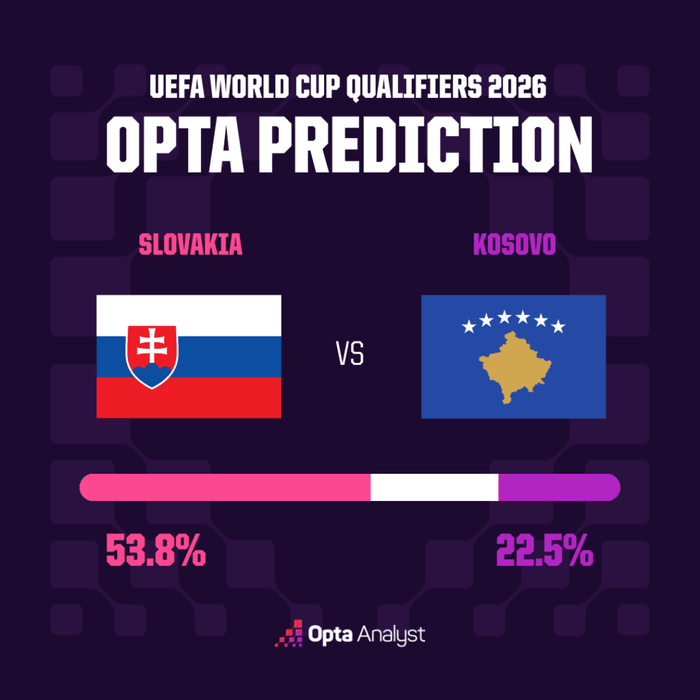A do të kalojë Sllovakia apo Kosova në finalen e ‘play-off’-it të Kupës së Botës 2026? Superkompjuteri i portalit Opta ka bërë parashikimin e ndeshjes, duke u bazuar në faktorët kryesorë nga ndeshjen e sotme (e enjte).