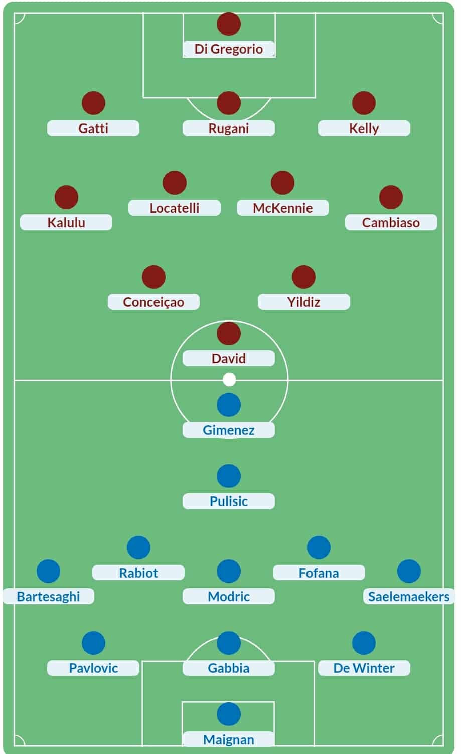 Edhe sonte Edon Zhegrova nuk besohet se mund ta nis ndeshjen nga fillimi, por mund ga shohim në fushë në pjesën e dytë. Bremer nuk pritet ta nis ndeshjen për shkak të lëndimit, dhe vendjn e tij pritet ta zë Rugani. Në sulm janë në balotazh Vlahovic-David, por duket se ky i fundit do të jetë titullar.