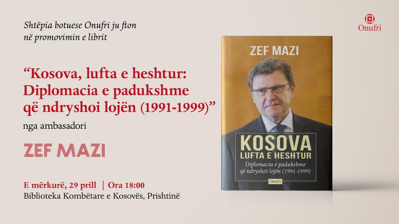 Shtëpia botuese Onufri ka njoftuar për promovimin e librit më të ri të ambasadorit Zef Mazi, me titull “Kosova, lufta e heshtur: Diplomacia e padukshme që ndryshoi lojën (1991–1999)”.