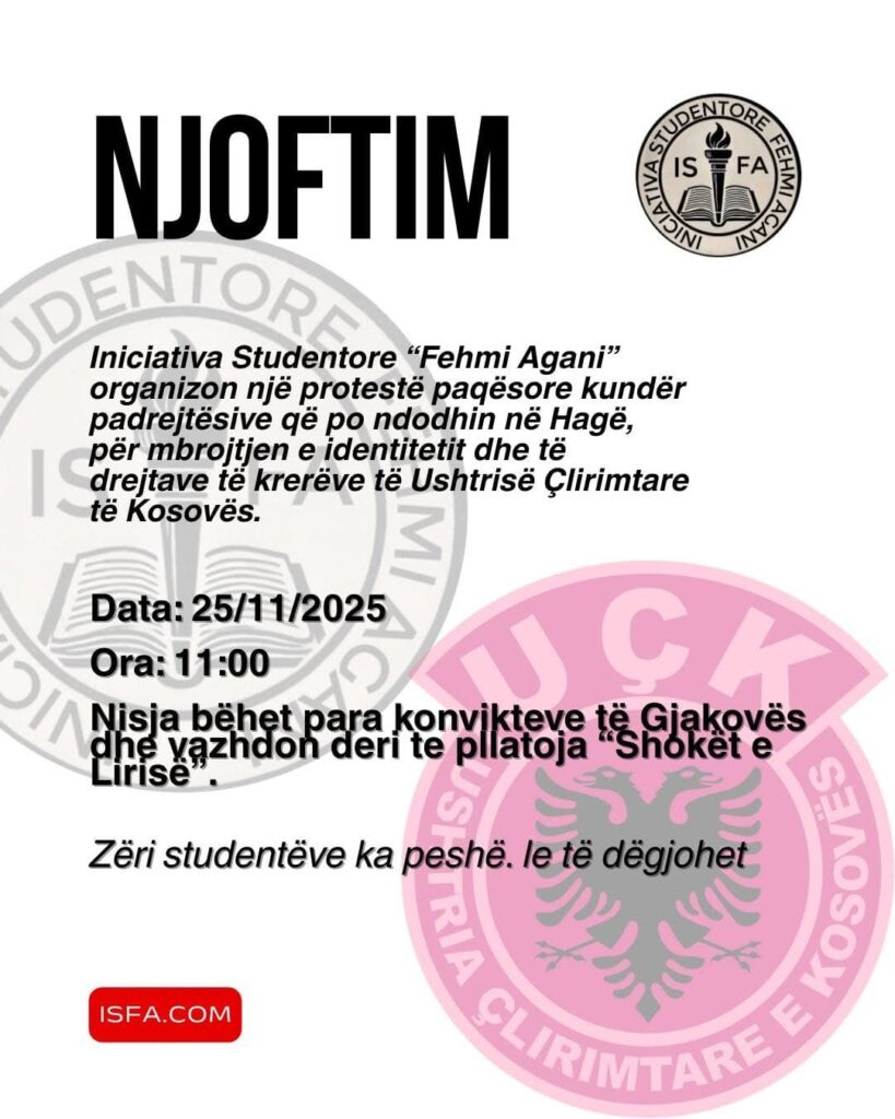 Iniciativa studentore “Fehmi Agani” organizon një protestë paqësore kundër padrejtësive që po ndodhin në Hagë, në mbrojtje të identitetit dhe të drejtave të krerëve të UÇK-së. Protesta do të mbahet më 25 nëntor, duke filluar nga ora 11:00.