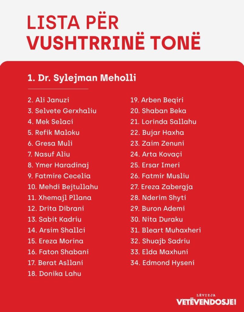 Lëvizja VETËVENDOSJE! në Vushtrri ka publikuar listën zgjedhore për Asamblenë Komunale. Pjesë e kësaj liste është edhe studentja e dalluar e Fakultetit Juridik, Elda Gani Maxhuni, nga fshati Maxhunaj i Vushtrrisë. Ajo do të garojë me numrin 33. Më poshtë është njoftimi i plotë i kandidatit për kryetar të Vushtrrisë, Sylejman Meholli, për kandidimin e Eldës si asambliste.