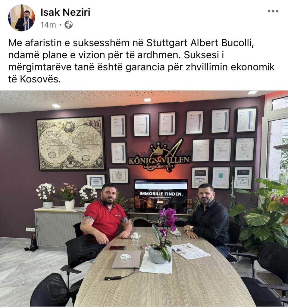 Afaristi shqiptar, Isak Neziri i cili ka shtrijen e bizneseve në Mynhen dhe Kosovë, ka vizituar afaristin drenicas që vepron në Shtuttgard, Albert Bucollin.