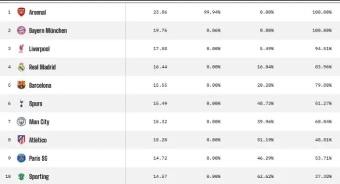 Bayern Munich i ndjek nga afër, gjithashtu me 100% probabilitet për raundin e 16-tave dhe 77.7% për çerekfinalet, megjithëse shanset për titull janë më të ulëta.