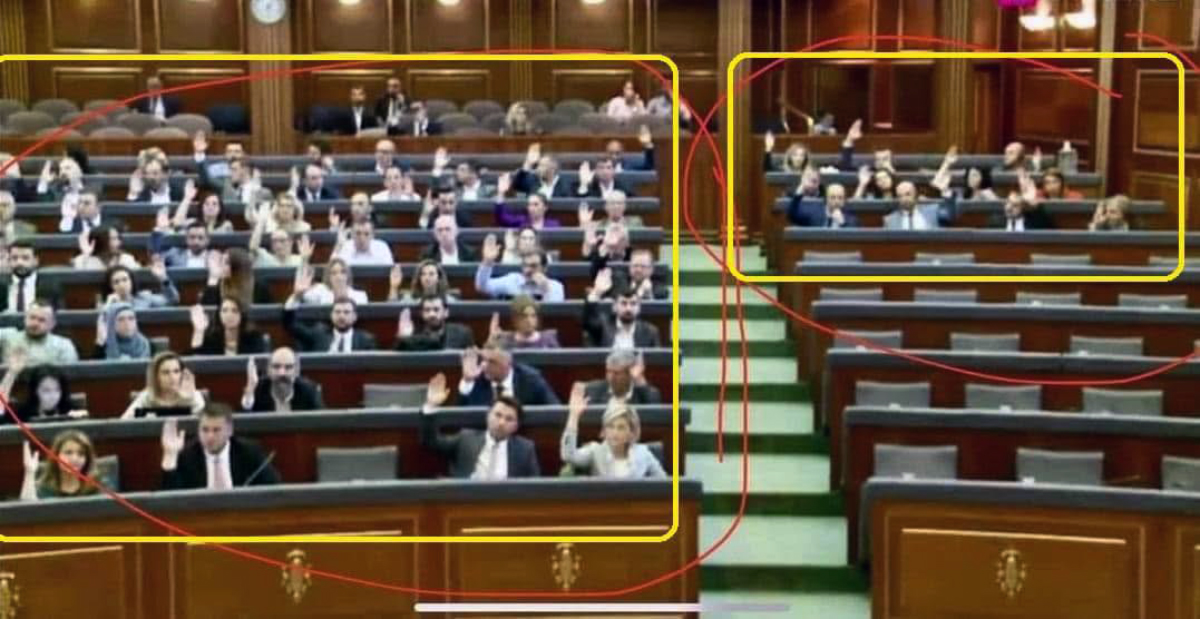 Aty shihen deputetët e LVV-së dhe të atyre të Listës Serbe, me duart e tyre të ngritura lart.