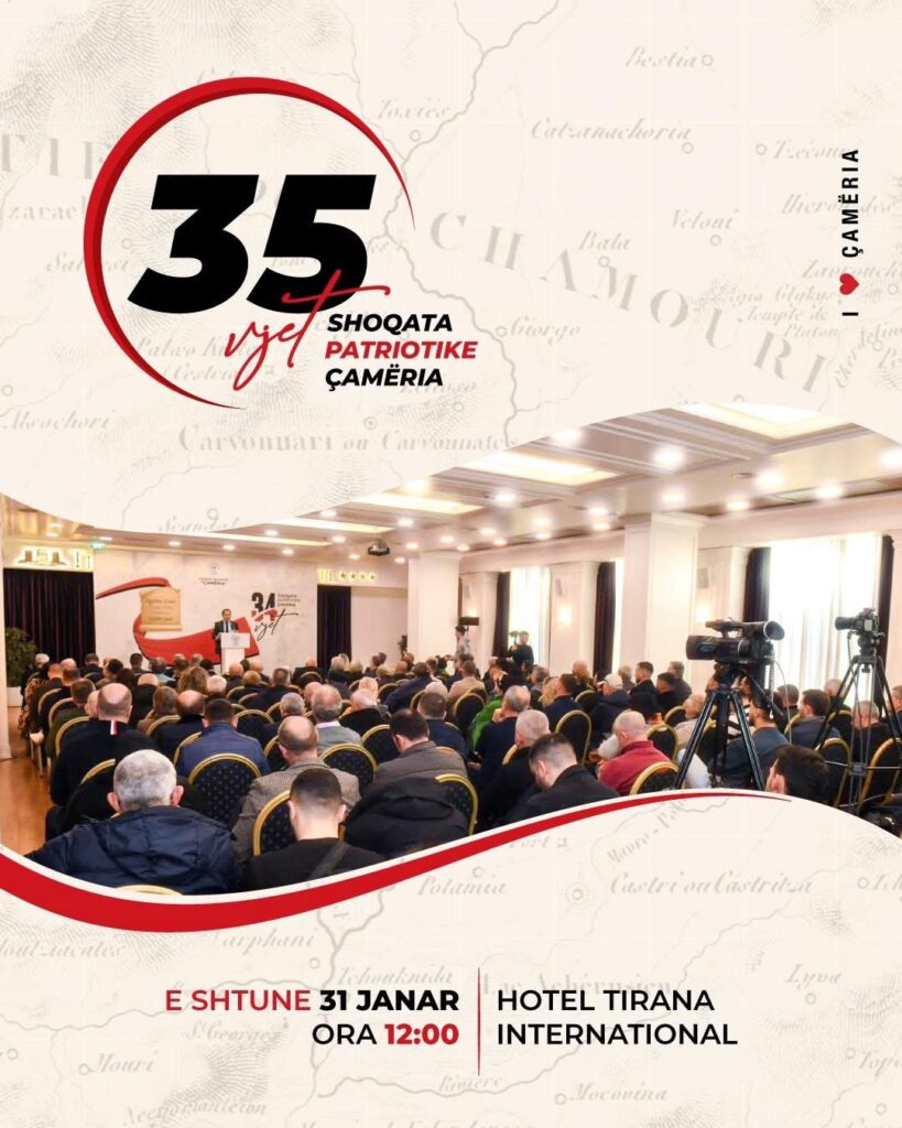 Shoqata Patriotike “Çamëria” do të organizojë një takim jubilar me rastin e shënimit të 35-vjetorit të krijimit të saj. Aktiviteti do të mbahet të shtunën, më 31 janar, duke filluar nga ora 12:00, në ambientet e Hotel Tirana International.