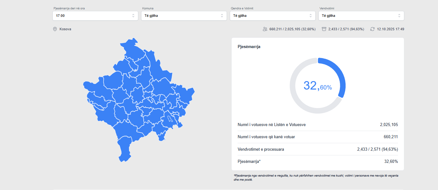 Deri në ora 17.49, sipas të dhënave të KQZ-së 660 mijë e 211 qytetarë kanë votuar, apo 32.60 për qind.