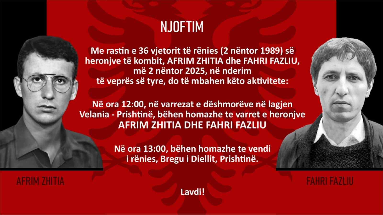 Me rastin e 36-vjetorit të rënies heroike të heronjve të kombit, Afrim Zhitia dhe Fahri Fazliu, më 2 nëntor 2025 (e diel) do të mbahen homazhe për nder të jetës dhe veprës së tyre.