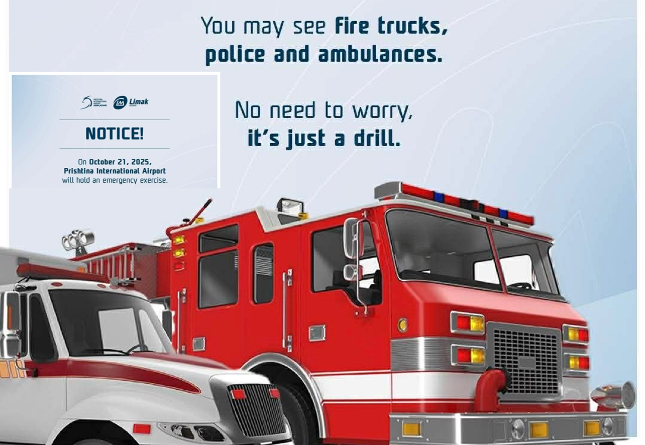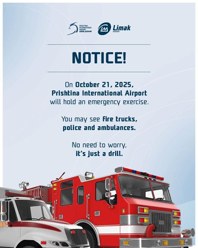 Për zhvillimin e kësaj stërvitjeje ka njoftuar Aeroporti Ndërkombëtar i Prishtinës (ANP) “Adem Jashari”. “Më 21 tetor 2025, Aeroporti Ndërkombëtar i Prishtinës do të zhvillojë një stërvitje të plotë emergjente. Ju mund të shihni kamionë zjarrfikës, polici dhe ambulanca si pjesë e këtij ushtrimi”, thuhet në njoftimin e Aeroportit Ndërkombëtar të Prishtinës.