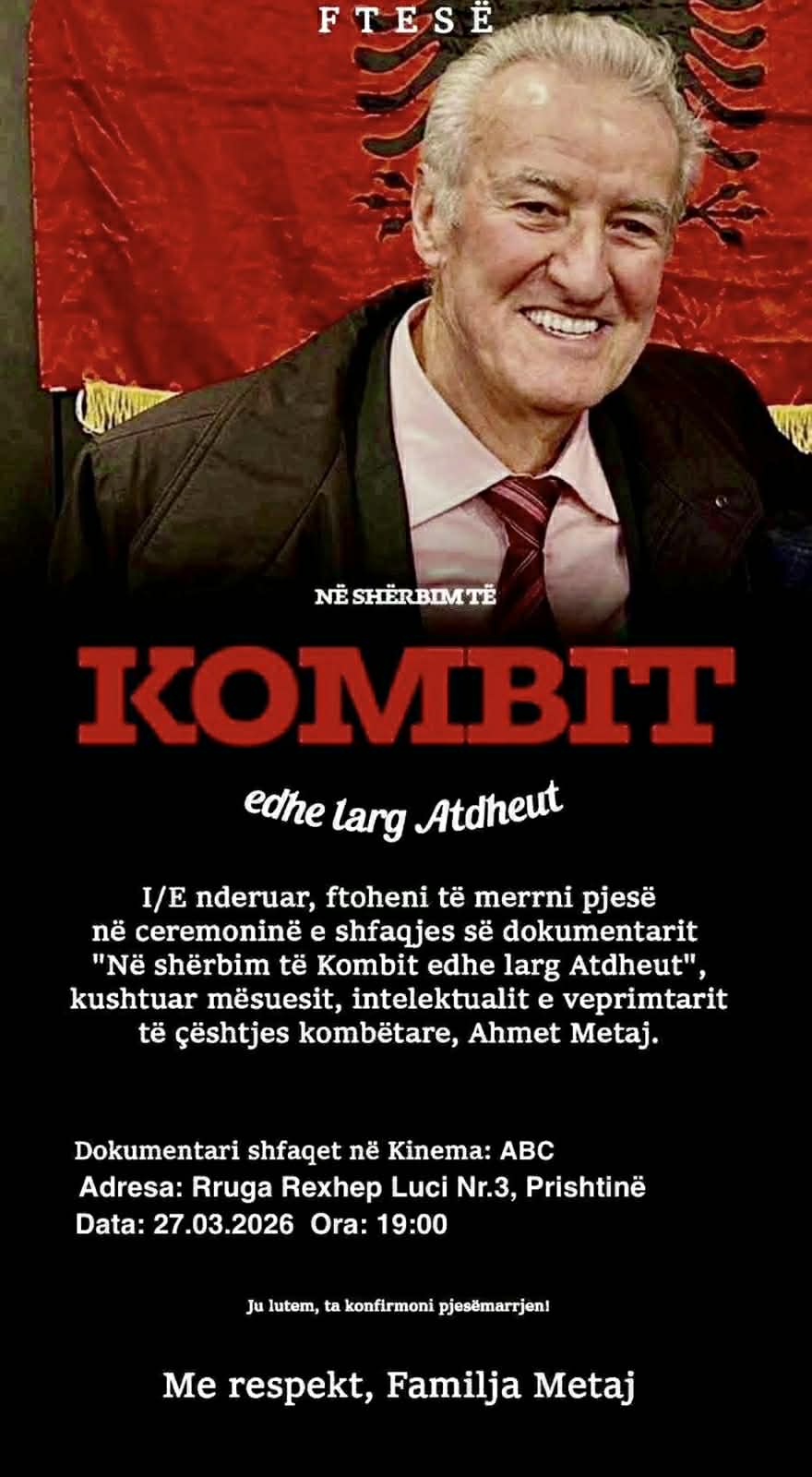 Të premten shfaqet dokumentari ‘Në shërbim të kombit edhe larg atdheut’, kushtuar veprimtarit Ahmet Metaj