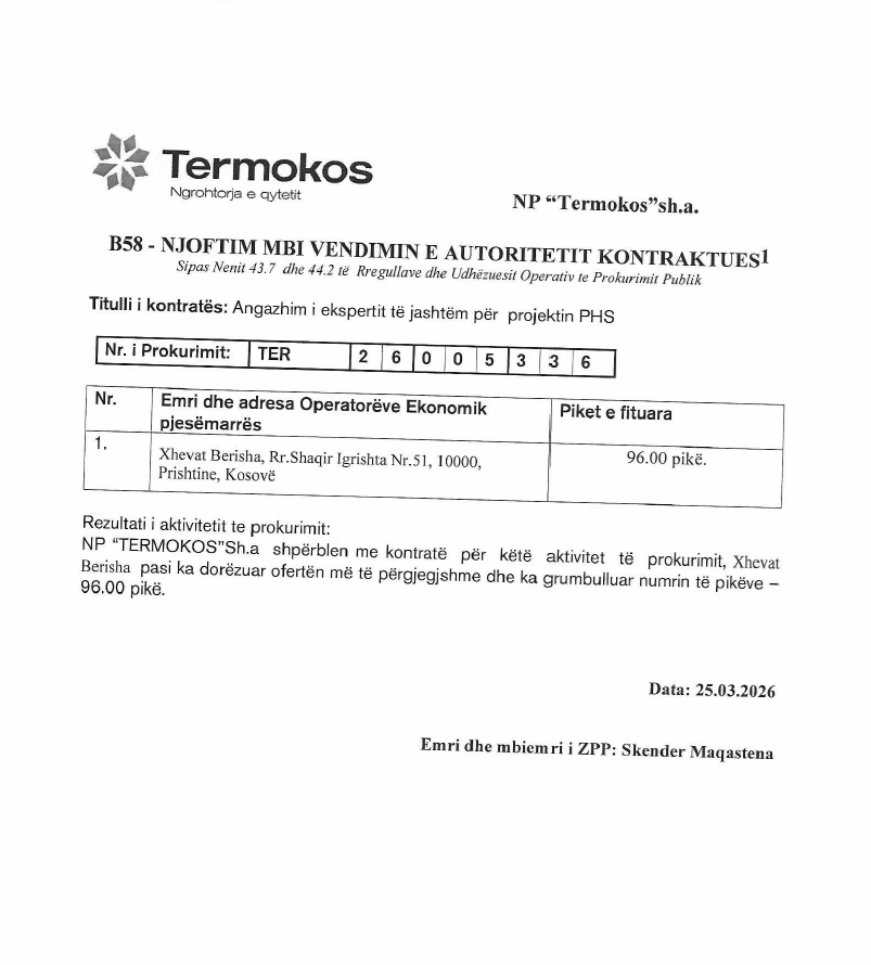 Ndërmarrja publike komunale Termokos ka angazhuar përmes një procedure tenderuese një ekspert të jashtëm ekonomik për një periudhë prej katër muajsh, me një vlerë totale prej 9,990 euro.
