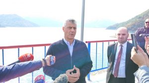 I pyetur nga gazetarët nëse planet për ndryshim të kufijve parashohin që Liqeni i Ujmanit t’i kalojë Serbisë, Thaçi tha: