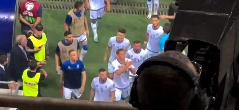 Tifozët rumunë e mbajtën mbi tre minuta banerin ku thuhej “Kosova është Serbi”. Pas kësaj, gjyqtari kryesor i çoi lojtarët në zhveshtore. Atyre iu është përgjigjur Mërgim Vojvoda me shqiponje.