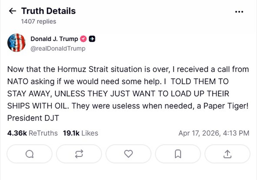 “Tani që situata në Ngushticën e Hormuzit ka mbaruar, mora një telefonatë nga NATO duke më pyetur nëse do të na duhej ndihmë. U THASH TË QËNDROJNË LARG, PËRVEÇ NËSE NUK DUAN VETËM TË MBUSHIN ANIJET E TYRE ME NAFTË. Ishin të padobishëm kur ishte nevoja, një Tigër Letre! President DJT”, shkruan Trump.