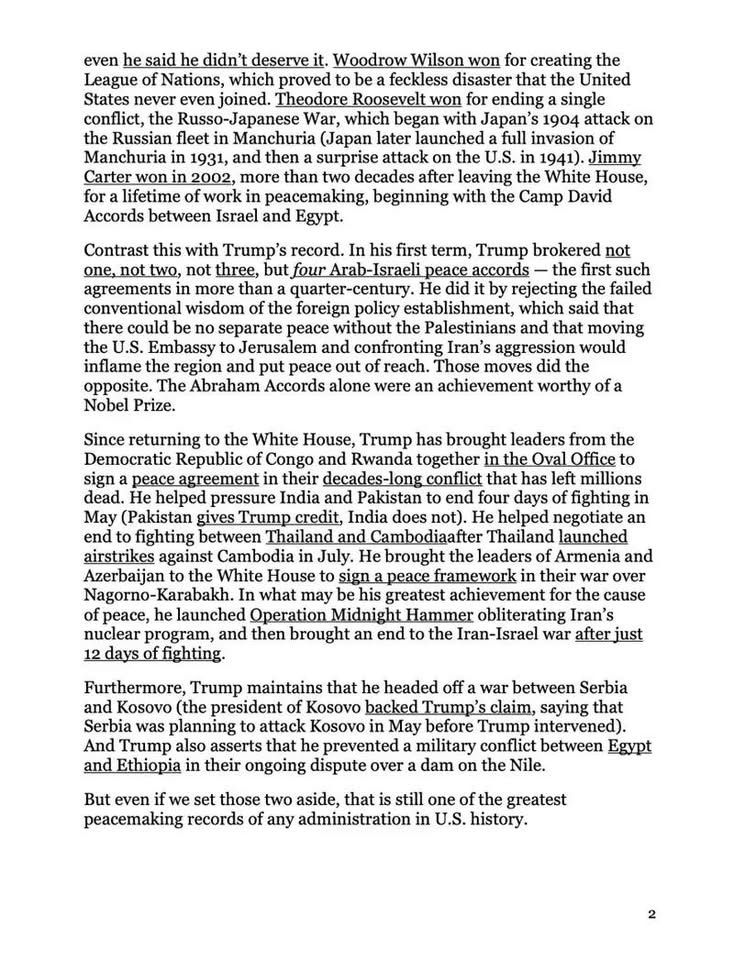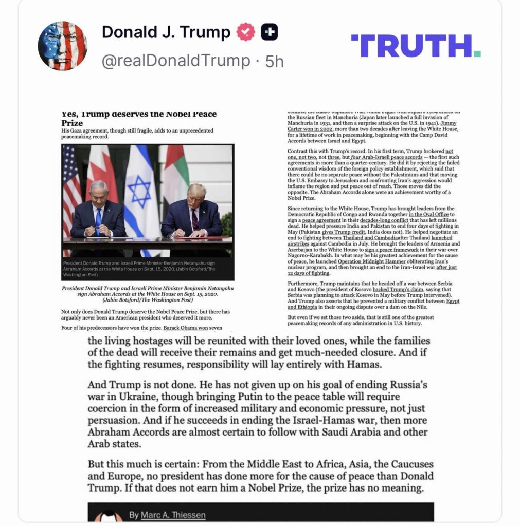 Pikërisht kjo pjesë përmendet në artikullin e “The Ëashington Post”, ku artikulohet arsyeja se pse Trump Meriton çmimin e paqes “Nobel”.