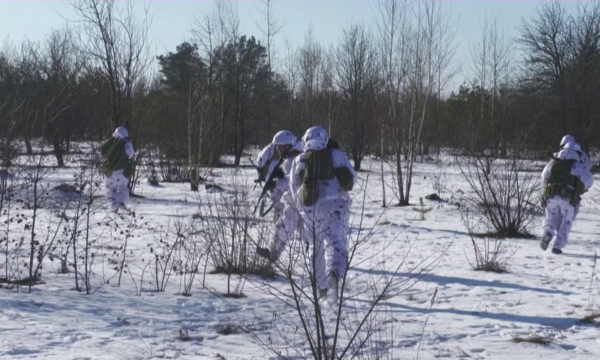 Forcat ukrainase zhvilluan stërvitje luftarake në rajonin verior Zhytomyr të martën e 30 janarit në një terren stërvitor të mbuluar me borë pranë kufirit me Bjellorusinë.