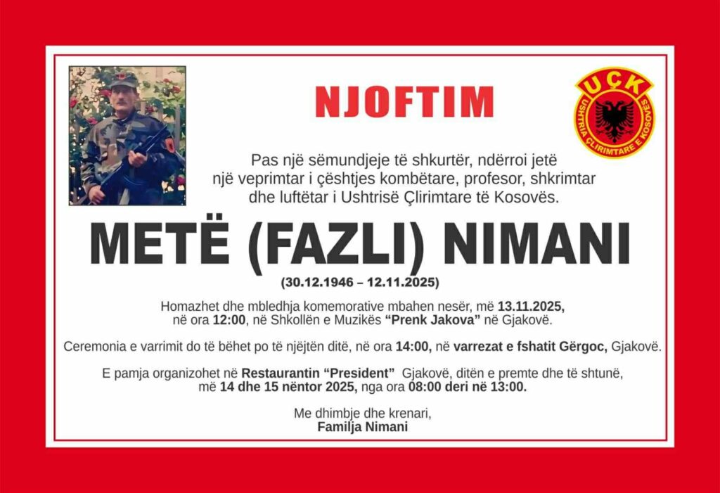 “Sot, më 12.11.2025, në orën 15:00, ndërroi jetë babai ynë, Metë Fazli Nimani.