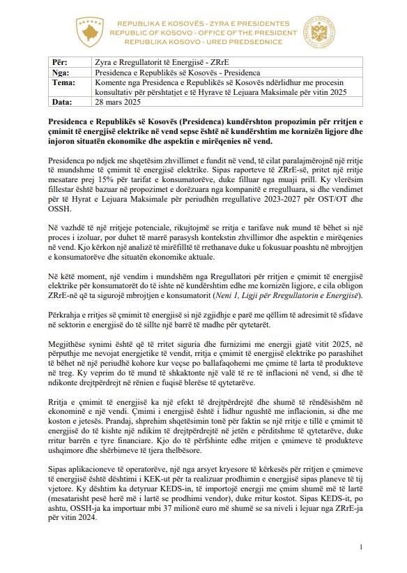 Ky qëndrim, siç lë të kuptojë Presidenca e Kosovës, pritet jetë të riprodhim i kundërshtimit institucional që Presidenca kishte bërë edhe vitin e kaluar, kur ZRrE po shqyrtonte rritjen e tarifave për vitin 2025. Në dokumentin e datës 28 mars 2025, Presidenca e Kosovës kishte kundërshtuar rritjen e çmimit të energjisë elektrike, duke argumentuar se një vendim i tillë ishte “në kundërshtim me kornizën ligjore” dhe se “injoron situatën ekonomike dhe aspektin e mirëqenies në vend”.