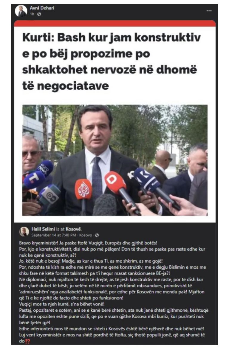 Deputeti i VV-së Avni Dehari sot gjatë ditës kishte shpërndarë një postim të një qytetari i cili kritikonte kryeministrin Kurti.