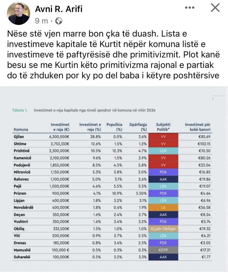 Zyratri i AAK-së, Avni Arifi ka reaguar, duke e kritikuar ashpër kryeministrin Kurti.