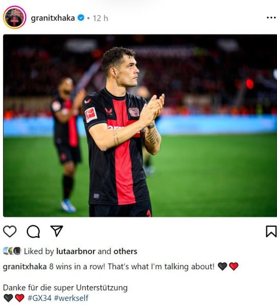 “Tetë fitore radhazi. Kjo është ajo për çka jam duke folur. Faleminderit për mbështetjen e madhe”, ka shkruar Xhaka në rrjetet sociale ish-futbollisti i Baselit, Borussia Monchengladbachut e Arsenalit.