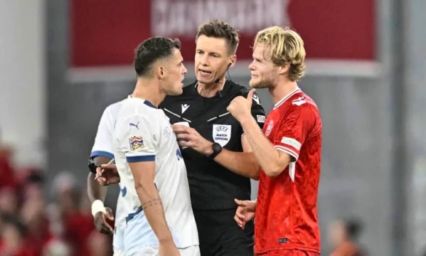 Mesfushori Granit Xhaka u ndëshkua me karton të kuq në ndeshjen që Zvicra e humbi 2-0 nga Danimarka. Në fillim të pjesës së dytë me karton të kuq u ndëshkua edhe Nico Elvedi i Zvicrës. Pas ndeshjes kapiteni i zviceranëve, Xhaka ka akuzuar kundërshtarët danezë për lojë të pistë.