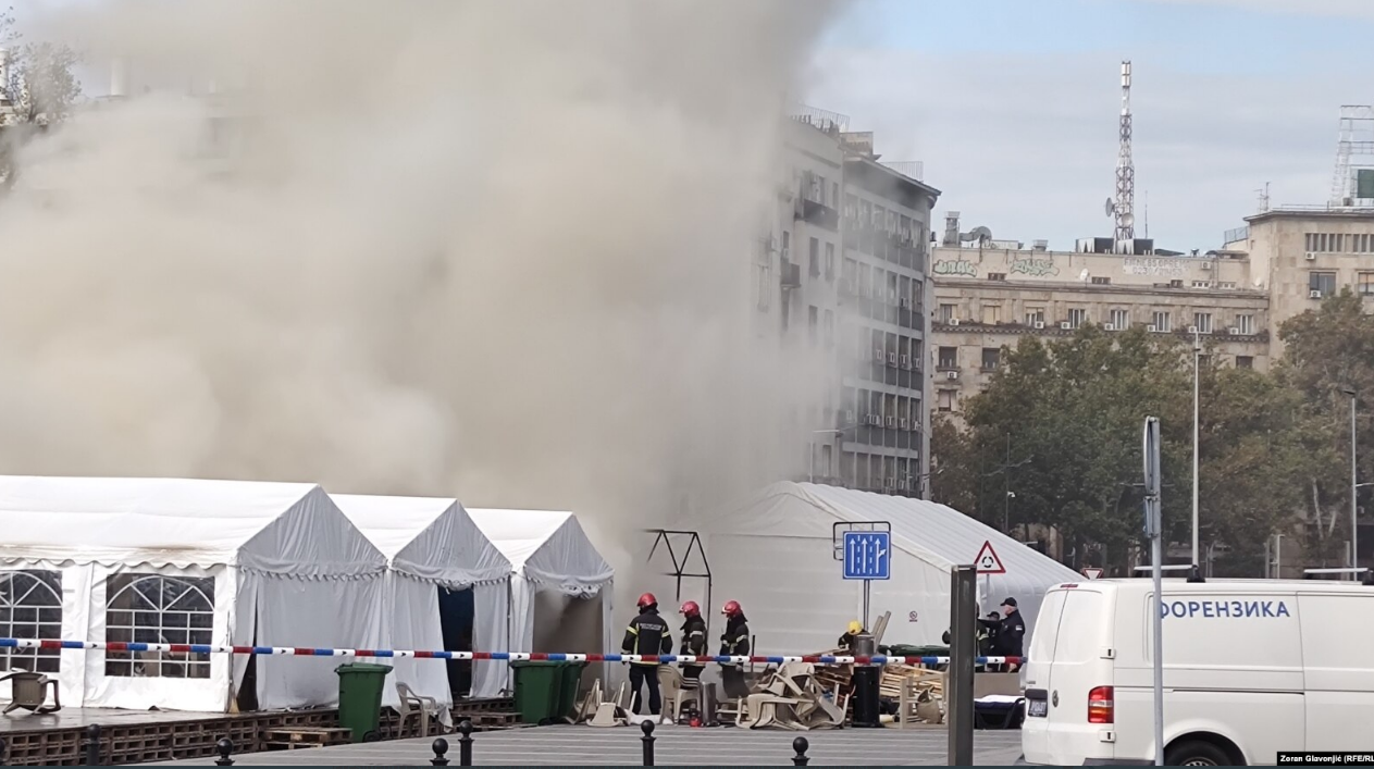Tenda – një nga disa që u vendosën këtë vit nga mbështetësit e Vuçiqit gjatë protestave kundër Qeverisë – u dogj plotësisht nga zjarri, i cili u shoqërua me tym të dendur.